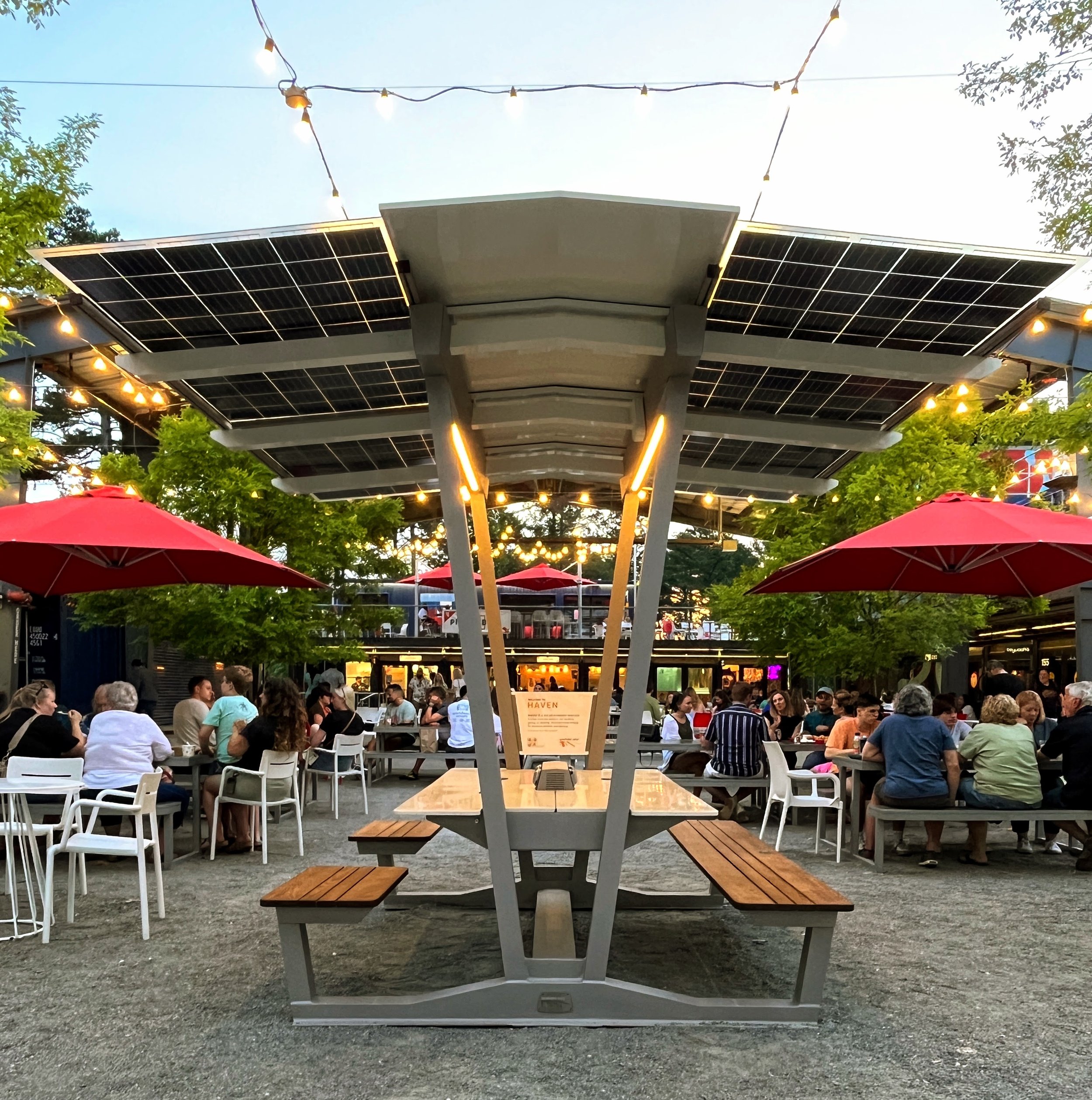 When people are outside a while, they like to have a place to charge up. That’s where outdoor furniture like solar tables comes in. Haven makes clean energy accessible for phones, of course, but also laptops, speakers, and scooters. With built-in batteries and solar panels, it’s a solar structure that delivers power, even at night.