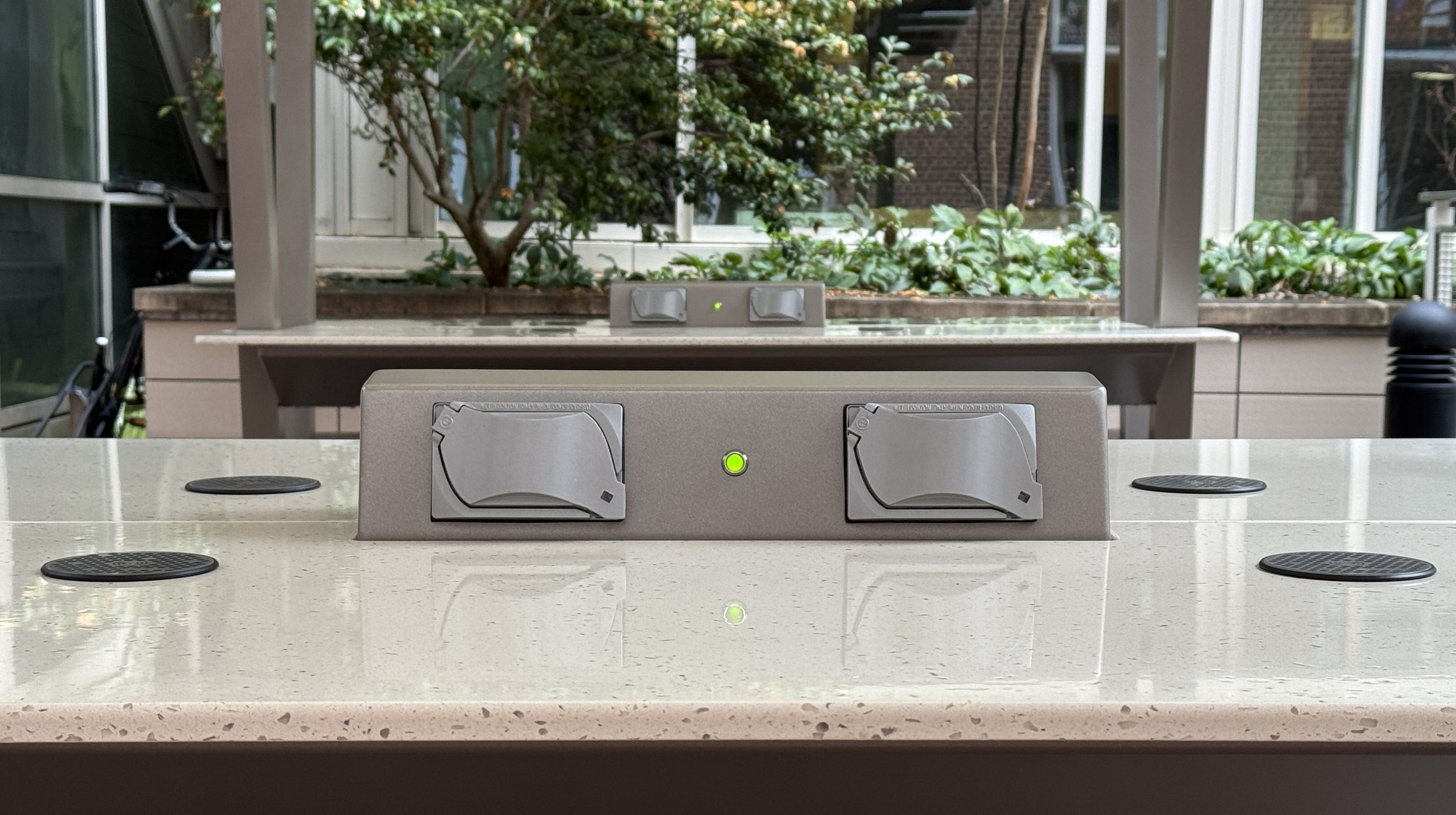 Haven has been thoughtfully engineered for safety. The power outlets weather rated and GFCI. The lithium batteries are the safest chemistry, according to the FAA. The batteries and electronics are in a fully enclosed, fire-proof aluminum container that also acts as a heat sink to keep components cool. All wires are hidden and inaccessible. All access doors are fastened by security bolts. The table has been engineered to hold 500 pounds of college students. The solar panels are rated for 175 MPH winds, and are composed of tempered glass bonded to a backsheet. A 300 lbs. person can hang from a solar panel without breaking it (we tested this). If the panels do break (like, if someone hits them with a brick), no glass will fall. And for the sake of toddlers’ heads, the bench tops and table have rounded corners.